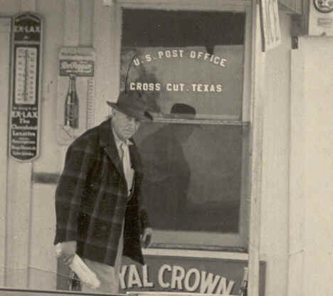 Mr. Bloodworth had brought a wagon full of store goods and opened a general store on Holloway creek. Mr. Holloway, Mr. Pentecost and others decided they needed a post office and came up with the name Cross Out cross country and out of the way. The application was sent to Austin and a post office was granted, but somehow the name got changed to Cross Cut. James Bloodworth was named postmaster and the name was established. A one room school was erected by the store and post office.