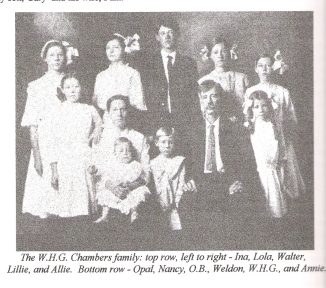 In October of 1910, three dusty wagons pulled into the yard of the old Howell place carrying its new owners. The lead wagon, pulled by a horse named Snip and a mule named Jack, was driven by Griggs. The double hitch pulling the second wagon was a mule named Rat, and a horse named Selim. On its seat was Nancy Chambers, Griggs wife. The third was driven by Walter Chambers, Griggs and Nancy's eldest son, and it was pulled by two horses named Streak and Lee. Griggs' and Nancy's loads consisted of kids and household goods. Walter's wagon was full of chickens. Probably why he was chosen to drive it, and why it was last in line. The branches of the family tree loaded aboard that little wagon train are depicted below: