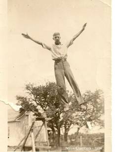 excellent place to practice wire walking. I was surprised at how easy it was to stand and walk on a cable with a balance pole. Holding the pipe was just as Bunny had described. It was like holding on to a solid rail. The physics explanation of inertia explained it perfectly. The resistance to movement by the pipe served as a remedy to any tendency to become unbalanced. When walking without the balance pole the arms served as the balance tool. After much practice the arms worked almost as well as the balance pole. When first switching from the pole to the arms weights held in each hand made the balance easier. After a few days of practice the weights could be discarded and the arms served well as balance poles. I built a practice cable about fifty feet long and a little over three feet high. I had a metal barrel on each end turned upside down which made a nice little platform for starting a walk. Then I graduated to an eight foot one. The highest wire I ever practiced on was about twelve feet above the ground. The only public performance I ever did was at school when I was in the tenth grade. I stretched a rope across the stage and did my show there. The kids thought it was a good thing to keep them from classes. From a financial standpoint the only money I ever made from wire walking was on a bet when I was working in the oil field a few years later. I bet the roustabout crew that I could walk a guy wire to the top of the drilling floor house, about 12 or 15 feet high at the top and 75 feet long. Some of them pooled their money and made the bet. Of course I took a joint of pipe as a balance pole and walked up the cable, then turned around walked back down. They didn’t know that I knew how to walk a wire. The lesson projected in this tale, if there is one, is to NEVER bet on another man’s tricks.